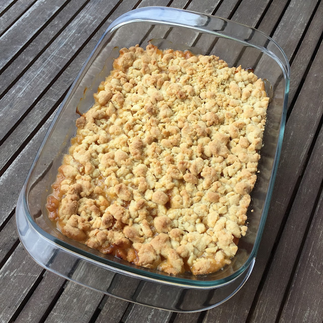 – Disposez les morceaux d’abricots dans un plat allant au four et recouvrez-les de la pâte à crumble.