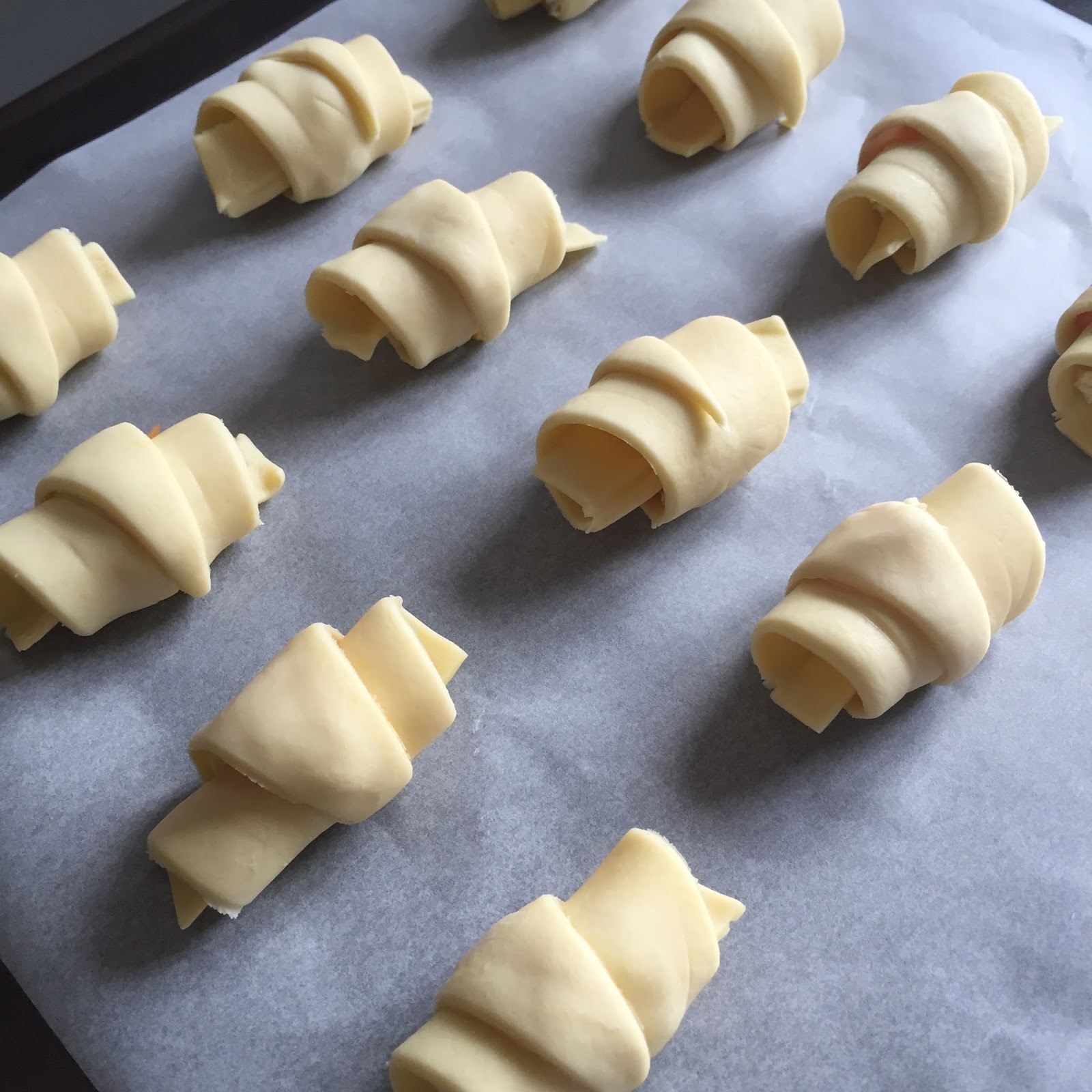 – Roulez les triangles de la base vers la pointe afin de former les croissants