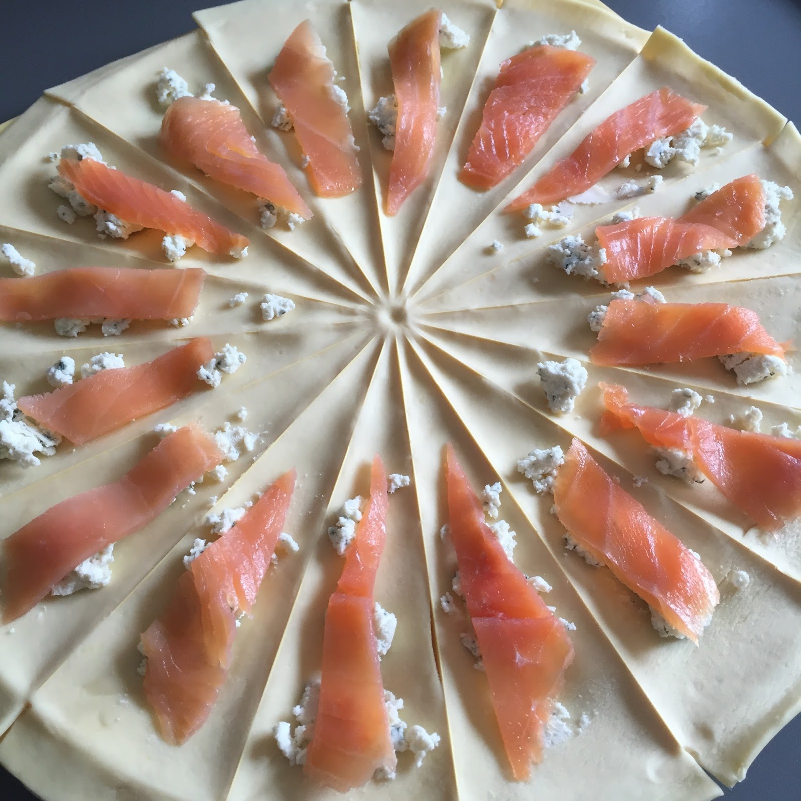 – Découpez le saumon en lanières et déposez-les sur les triangles