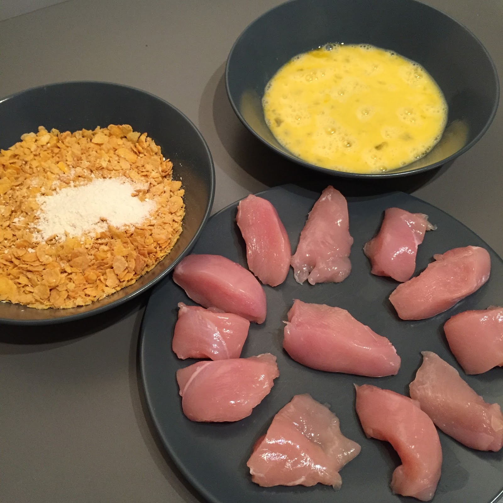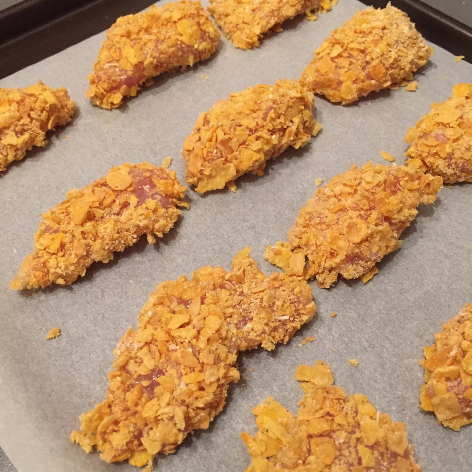 – Plongez chaque morceau de poulet dans l’œuf battu, puis dans le mélange Corn Flakes / parmesan. Disposez au fur et à mesure les nuggets sur une plaque recouverte de papier cuisson.