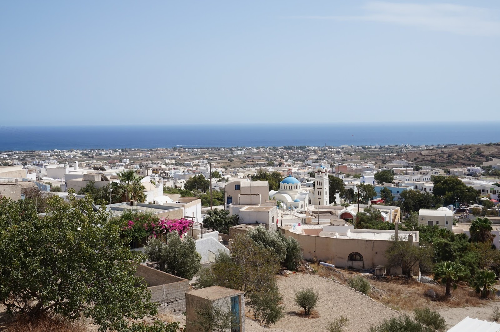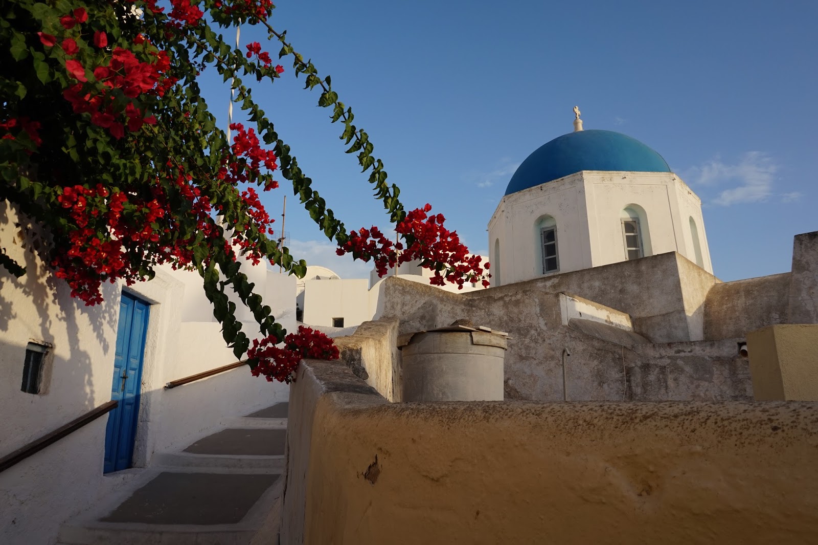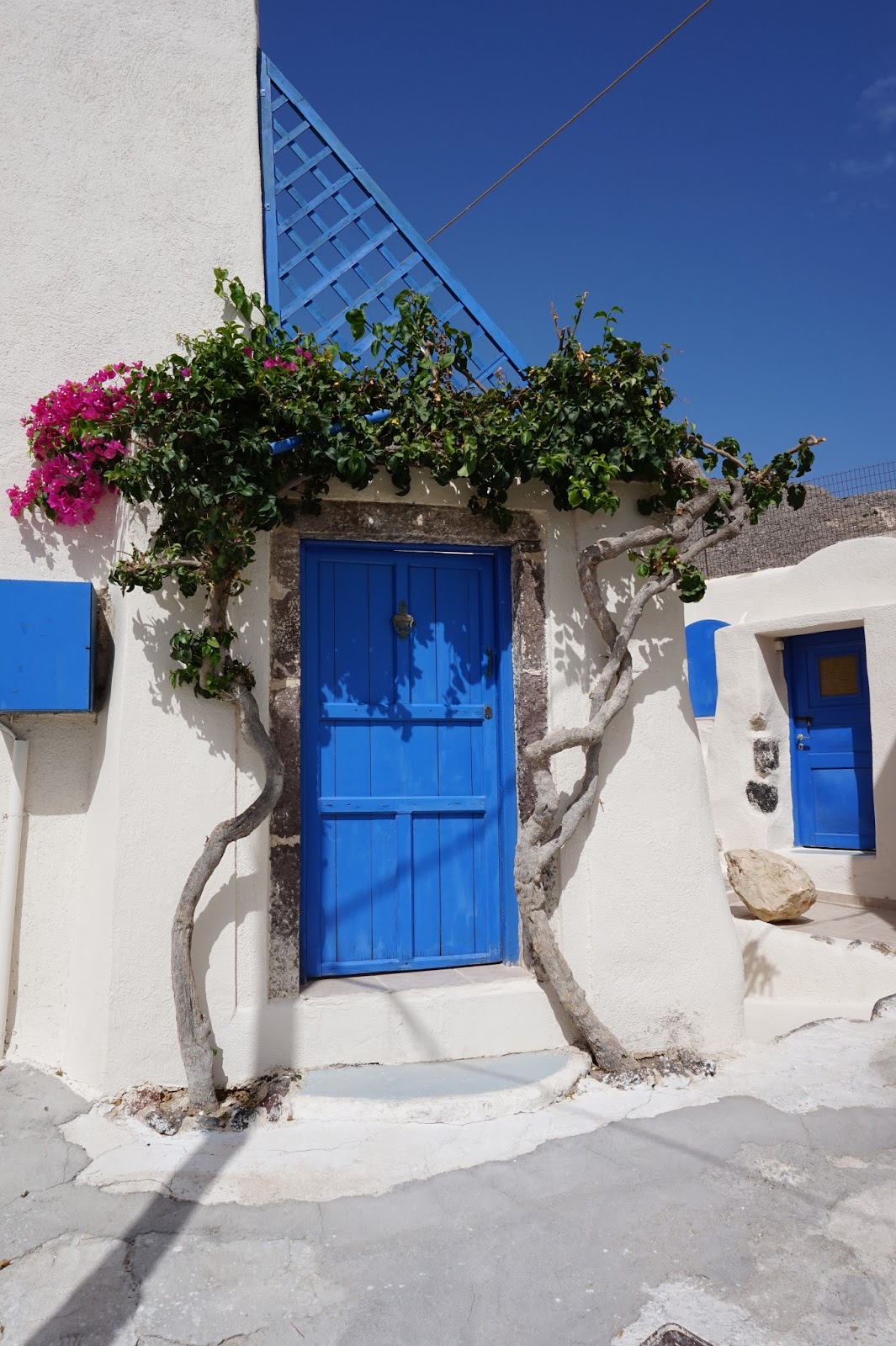 Nous avons visité Emporio, Pyrgos et Megalochori. Par rapport à Fira et Oia, ces villages sont beaucoup plus calmes et plus petits. C’est très agréable de flâner dans les ruelles, de découvrir de jolies places ombragées, d’admirer les portes colorées et bien sûr de s’émerveiller encore et toujours devant les maisons blanches et les dômes bleus !