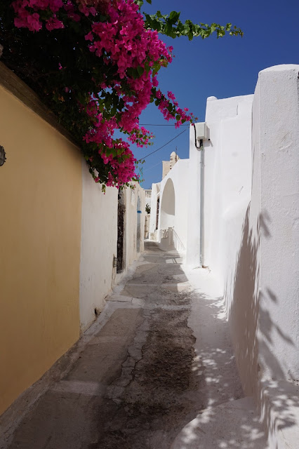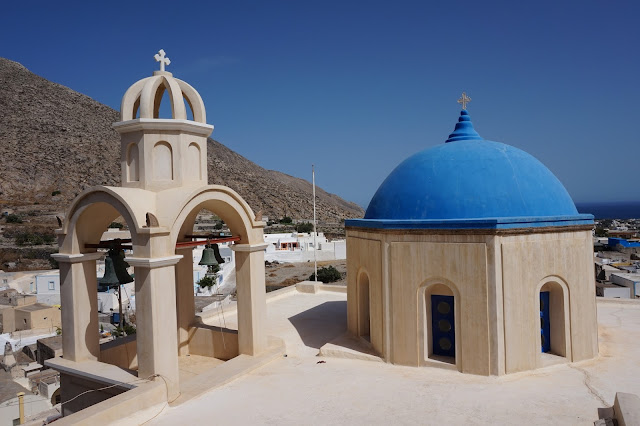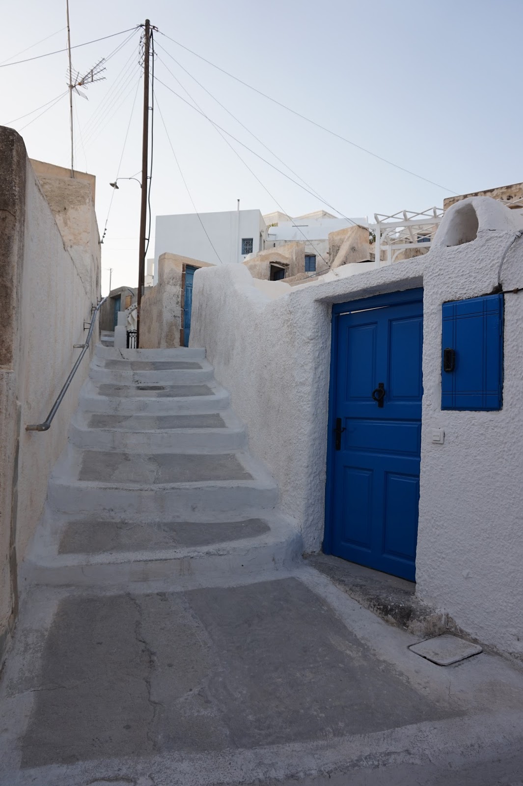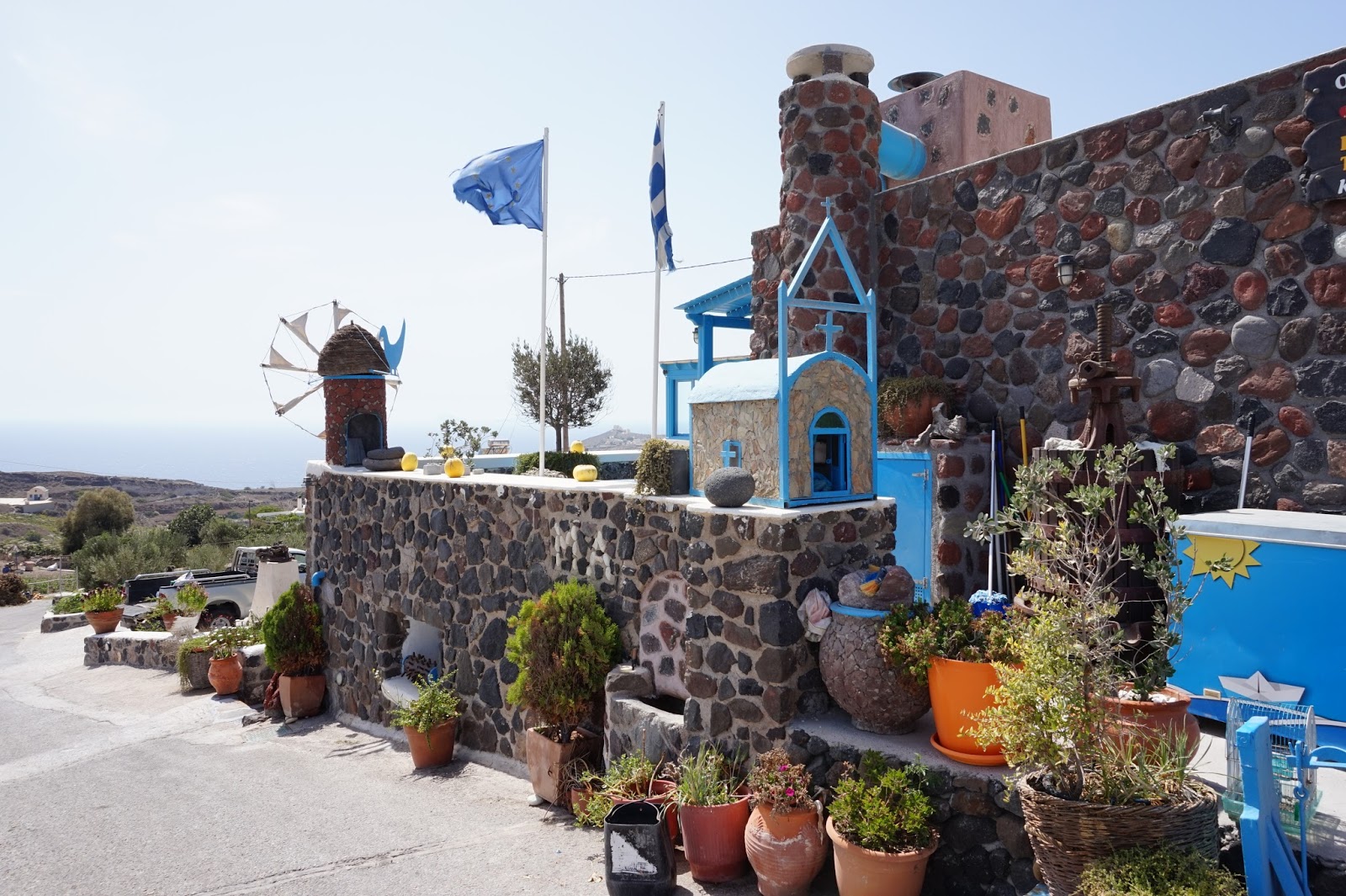 Nous avons visité Emporio, Pyrgos et Megalochori. Par rapport à Fira et Oia, ces villages sont beaucoup plus calmes et plus petits. C’est très agréable de flâner dans les ruelles, de découvrir de jolies places ombragées, d’admirer les portes colorées et bien sûr de s’émerveiller encore et toujours devant les maisons blanches et les dômes bleus !