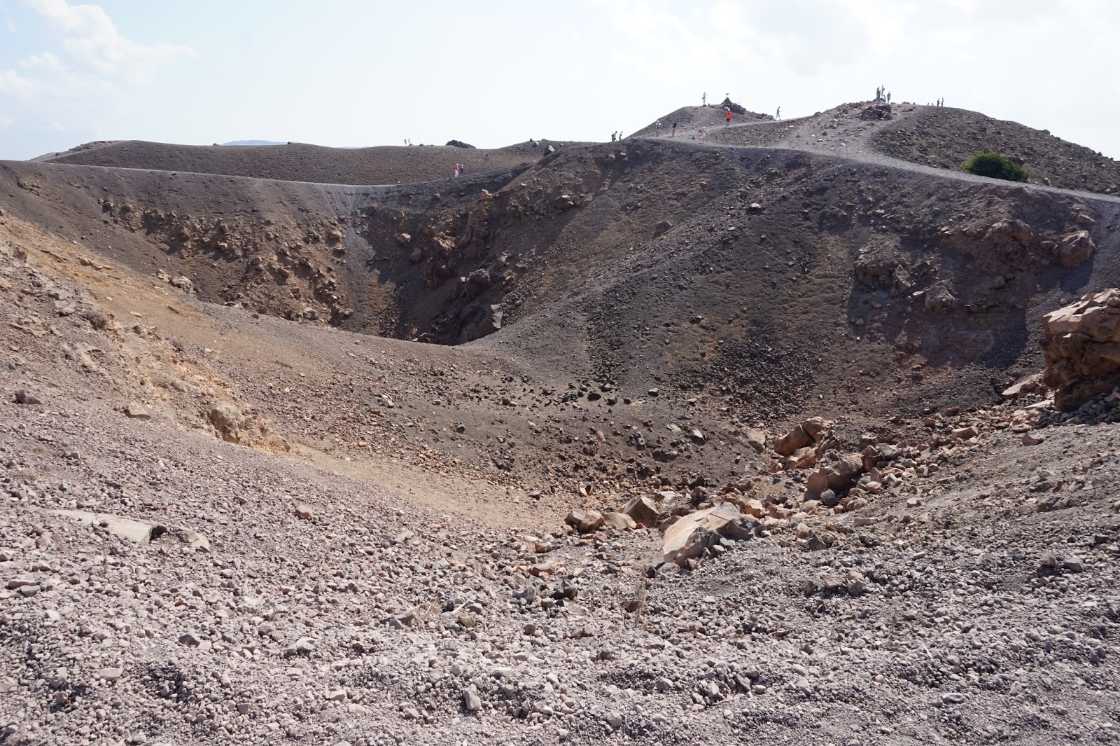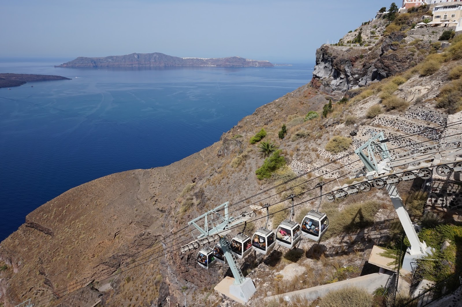Plusieurs compagnies proposent différentes excursions : visite du volcan, visite du volcan et eaux chaudes ou encore visite du volcan, eaux chaudes et l’île de Thirassia. Nous avons choisi de faire l’excursion « volcan & eaux chaudes » avec Dakoutros – 18€ par personne / 3h d’excursion. Le départ se fait du port de Fira. Pour y accéder, il y a 3 possiblités : à pied (20 minutes), à dos d’âne ou en téléphérique (5€ par personne – attention à la queue pendant la haute saison). Le trajet en bateau offre une superbe vue sur Fira et les falaises. Le bateau fait un premier arrêt pour un moment baignade dans les eaux chaudes de couleur rouge-orangé. Puis, direction le volcan Néa Kaméni qui est toujours en activité. Sur le volcan, c’est parti pour une randonnée d’une heure environ pour découvrir un joli paysage lunaire assez impressionnant.