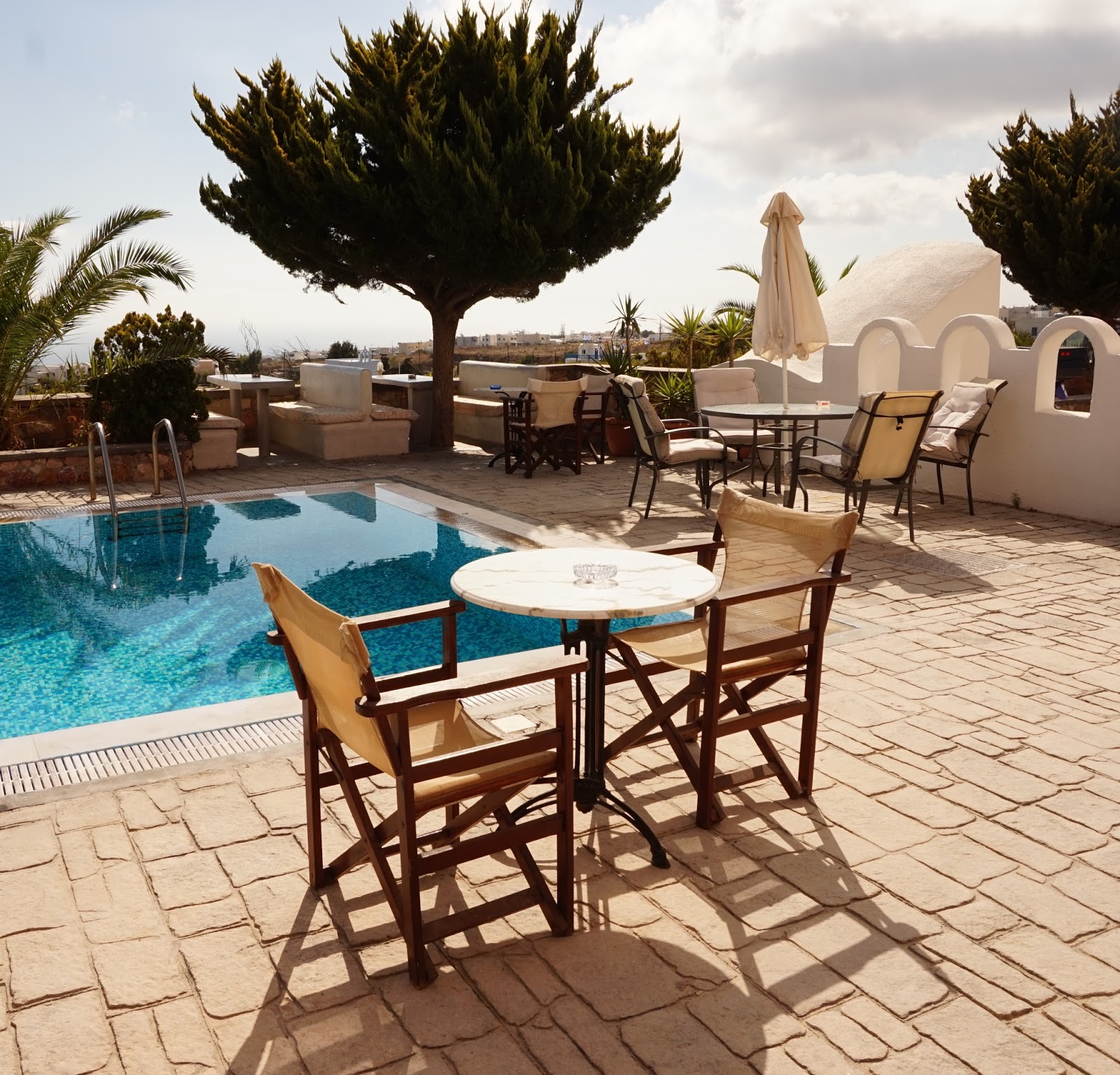 Nous avons choisi de loger à Fira, la capitale de Santorin – à l’hôtel Villa Koronios. Nous avons payé 300 € pour une chambre double pour 5 nuits, soit 60 € la nuit. Nous avons l’habitude de loger dans des hôtels avec un certain standing et à vrai dire, nous avions choisi notre hôtel par défaut et nous avions peur de le regretter. Comme je vous l’expliquais dans l’article A la découverte des Cyclades, les hôtels qui nous faisaient rêver étaient excessivement chers – même en septembre ! Nous avons donc choisi de loger dans un hôtel « classique » à un prix raisonnable et de se faire plaisir sur les activités, les restaurants … que de dépenser une grosse somme dans un sublime hôtel. Avec du recul, nous ne regrettons pas du tout notre choix. L’hôtel Villa Koronios offre un excellent rapport qualité/prix =)