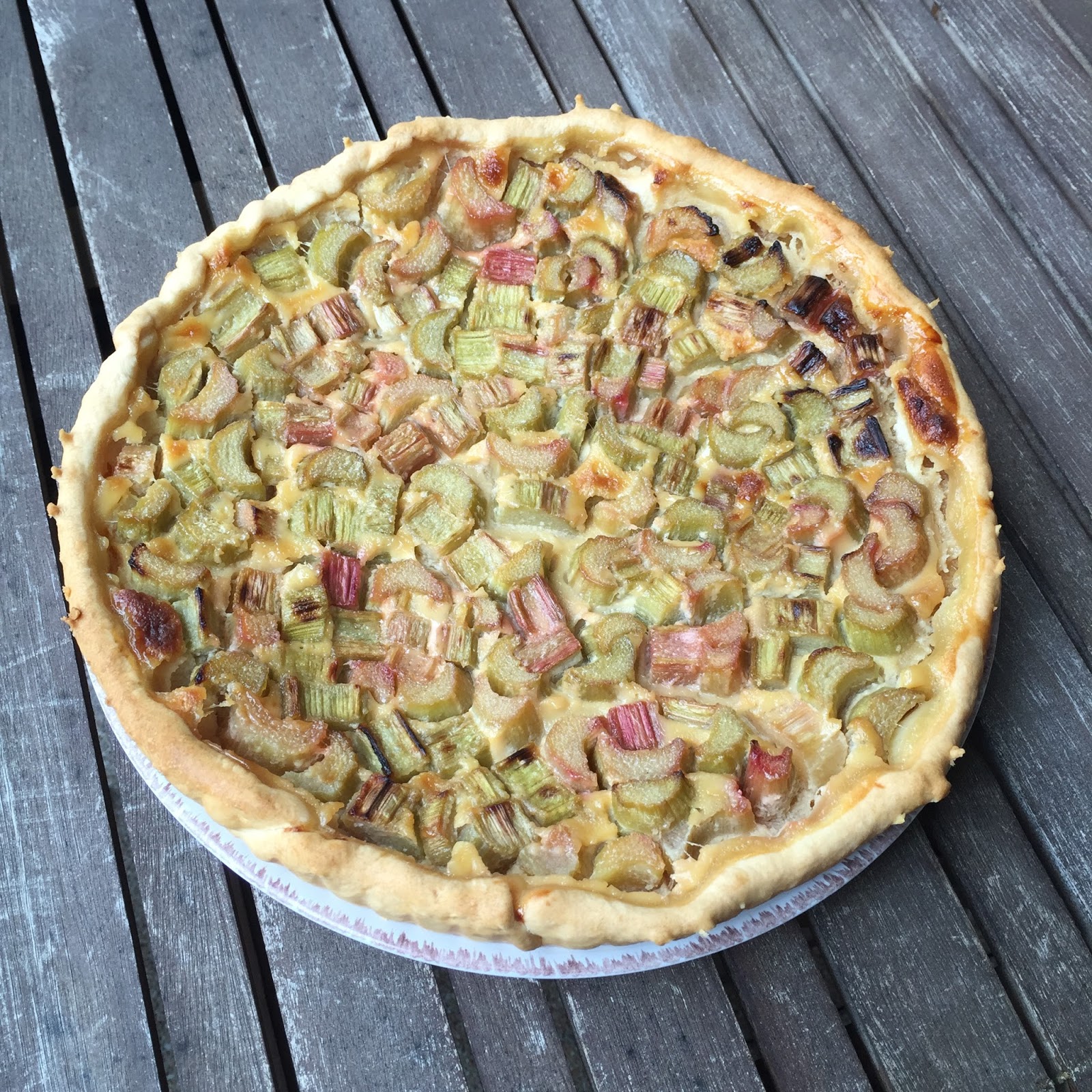 | Morceaux de rhubarbe disposés sur la pâte brisée |